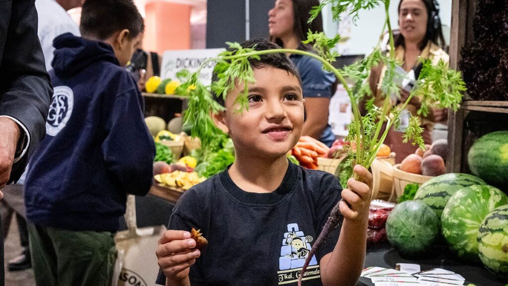 Lucas Ceballos joins fellow students in sampling menu items on Robert F. Kennedy Community Schools in Los Angeles on August 7, 2025. (Sarah Reingewirtz/Medianews Group/Los Angeles Daily News via Getty Images)