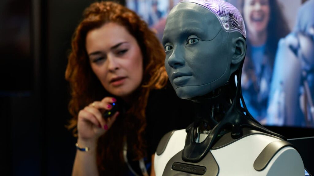An artificial intelligence has powered Ameca robot at an exhibition absenteeism at the London Tech Week Exposition in London, United Kingdom, on Monday 9 June 2025. London Tech Week runs until 13 June (Jason Alden/Bloomberg via Getty Images)