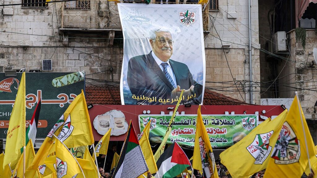 A large banner depicting Palestinian President Mahmud Abbas hangs from a building as supporters of the Fatah movement gather with their flags for a rally on December 29, 2024. (Jaafar Ashtiyeh/AFP via Getty Images)