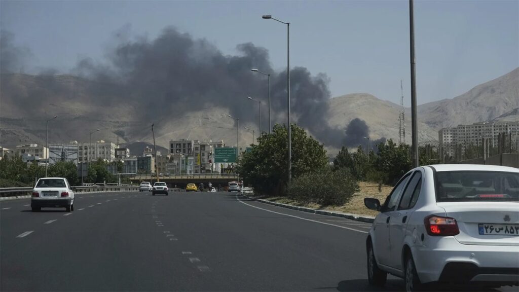Cars drive on a highway as smoke rises from an oil warehouse after it appeared to be hit by an Israeli attack in Tehran, Iran, on Saturday, June 16, 2025. (AP Photo/Vahid Salemi)