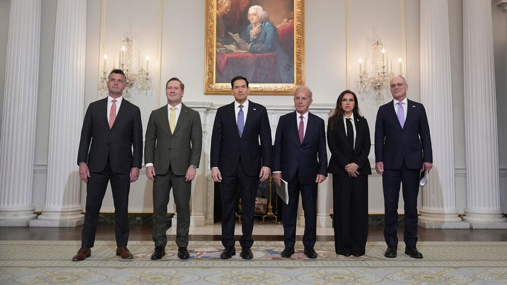 From left to right, State Department adviser Michael Needham, U.S. Ambassador to the United Nations Mike Waltz, Secretary of State Marco Rubio, U.S. Ambassador to Lebanon Michel Issa, Lebanese Ambassador to the U.S. Nada Hamadeh Moawad and Israeli Ambassador to the U.S. Yechiel Leiter pose for a photo before a meeting at the State Department in Washington, April 14, 2026. (Jacquelyn Martin/AP Photo)