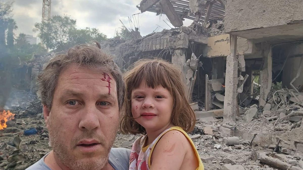 Eyal, husband of Michal Weits, holds their daughter in front of the rubble of their Tel Aviv home after it was hit by an Iranian missile during the 12-day war. (Michael Weits)