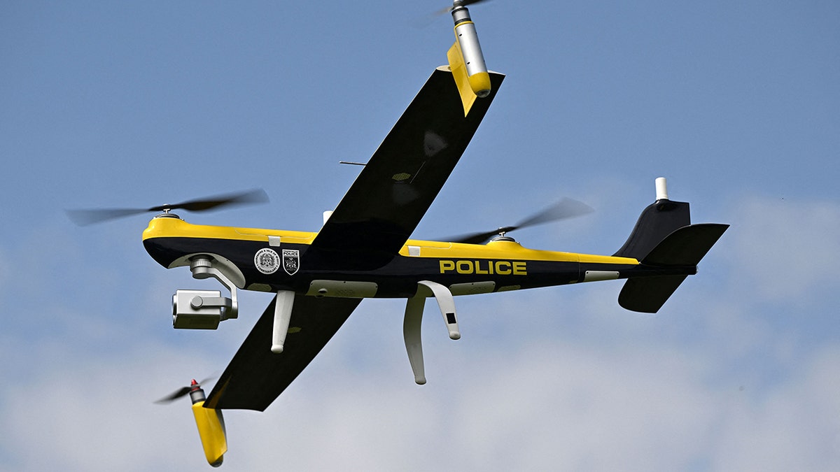 A Autel Robotics Dragonfish Standard Drone during the flight during a demonstration of media events in a police training facility of Thames Valley in Sulhamstead near Reading on August 24, 2023. (Justin Tallis/AFP via Getty images)