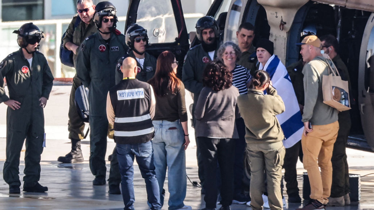 Keith Siegel, accompanied by his wife Aviva (to his left), disembarks from a military helicopter at the Tel Aviv Sourasky Medical Center (Ikhlov) on February 1, 2025. (Getty Images)