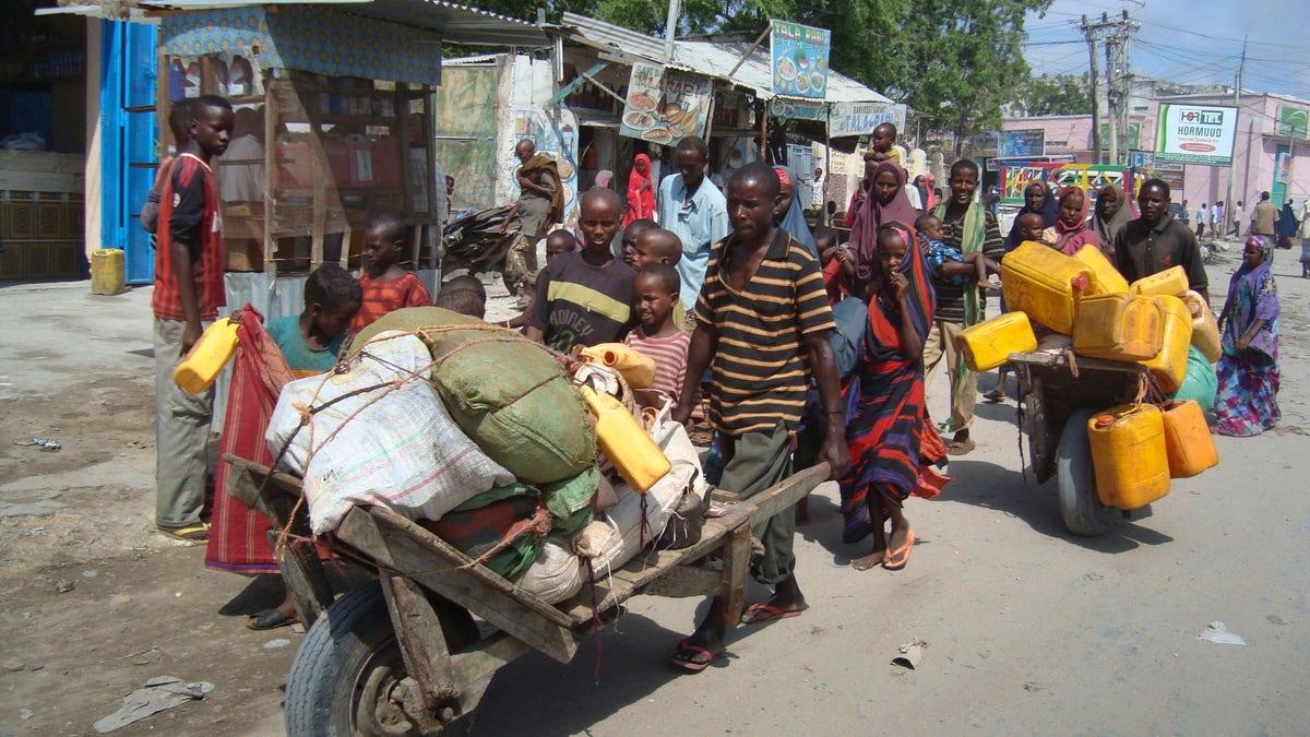Somalis from South Omalia who carry their possessions go their way to a new camp for internally displaced people in Mogadishu, Somalia. July 2011. (Associated Press)