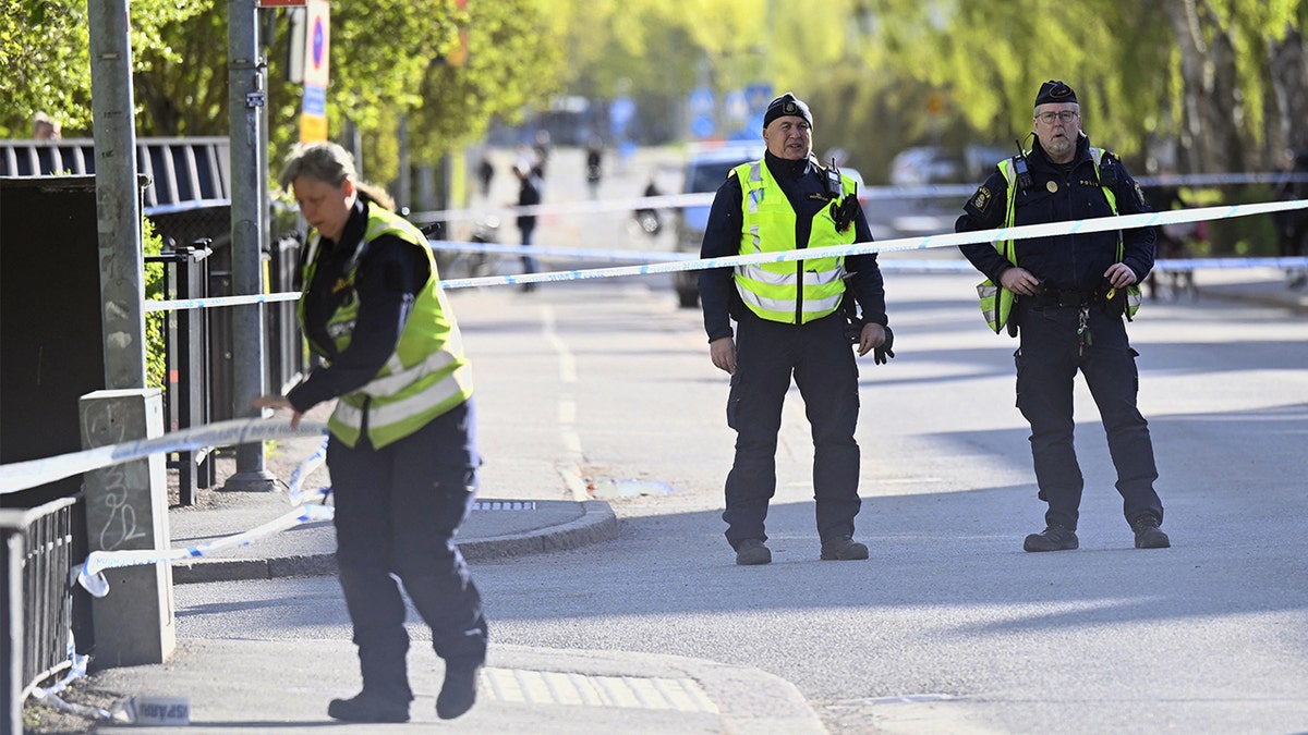 Police officers of passers -by who work in a crime scene in Central Uppsala, Sweden, April 30, 2025. (Fredrik Sandberg/TT News Agency/AFP via Getty images)