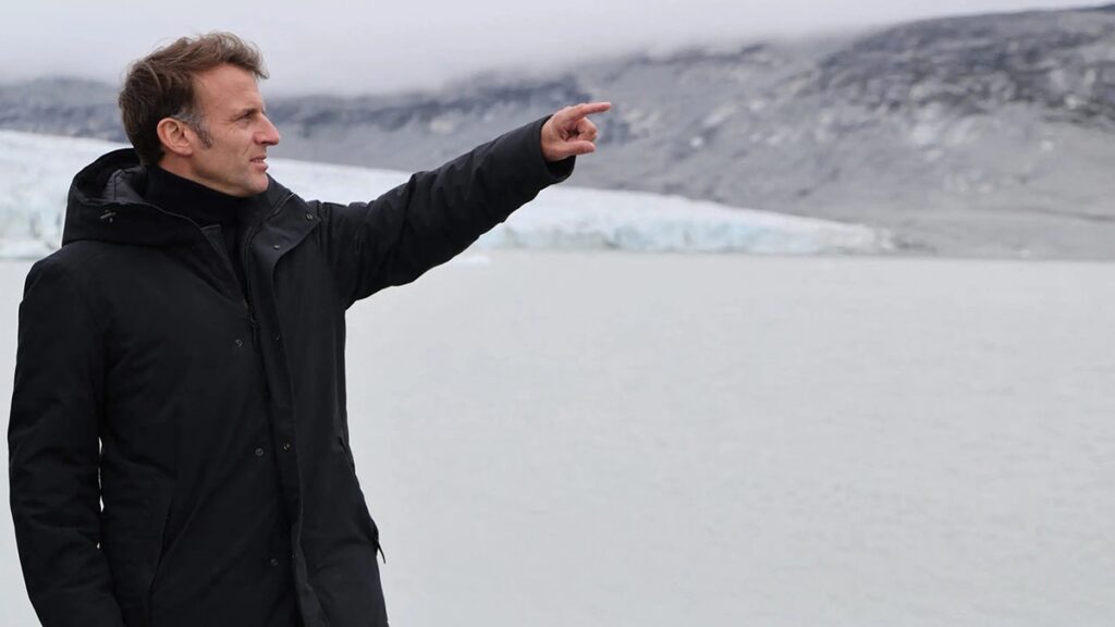 French President Emmanuel Macron gestures while on June 15, 2025 he is on the Glacier Mont Nunatarsuaq during a visit to Greenland. (Ludovic Marin/AFP via Getty images)