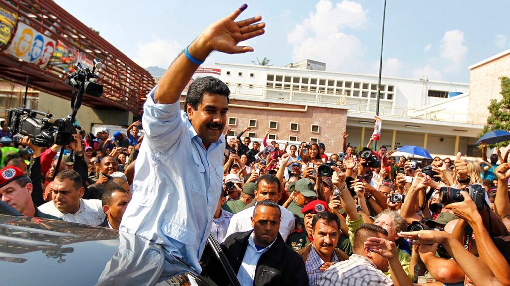 Acting Venezuelan President Nicolás Maduro waves to supporters as he leaves after voting for late President Hugo Chavez’s successor in Caracas on April 14, 2013. (Carlos Garcia Rawlins/Reuters)