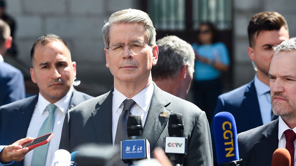 Treasury secretary Scott Bessent focuses on the media while leaving a meeting with Chinese representatives on September 15, 2025 in Madrid, Spain. (Gustavo Valiente/Europe Press via Getty images)