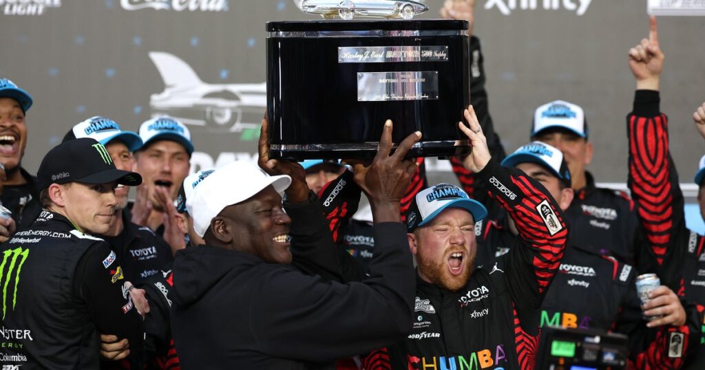 Neither did Jordan, who met Reddick in victory lane for a bear hug and the two then jointly hoisted the Harley J. Earl trophy into the air. Jordan, who turns 63 on Tuesday, will receive a Daytona 500 ring for his birthday and announced in victory lane that he wears a size 13.