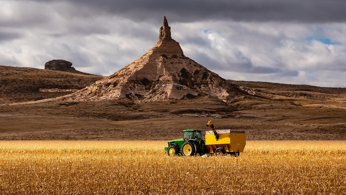 Tractor with mowing porter on farm field and chimney rock, Scotts Bluff National Monument in Nebraska. (Hawk Buckman/Design Pics Editorial/Universal Images Group via Getty Images)