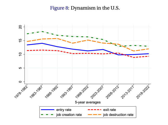 While Schumpeter argued that this process would ultimately lead to the demise of capitalism, Aghion and Howitt claim to have shown that it is sustainable and essential for the long-term flourishing of the system. But as economic power has become more concentrated, indicators of creative destruction – such as the number of business creations and liquidations – have fallen in the US and several other developed countries since the 1980s, along with the average economic growth rate, their work shows. See this diagram from the Nobel Prize Committee’s detailed article on the work of the winners: